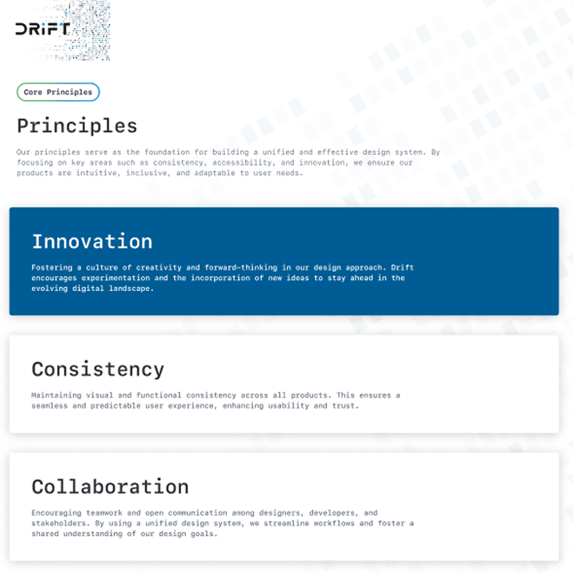 Drift started as a growing Figma file teams relied on but could not fully trust. Components lacked structure, documentation was thin, and design did not consistently match code. My role was to turn it into something teams could actually build fromO